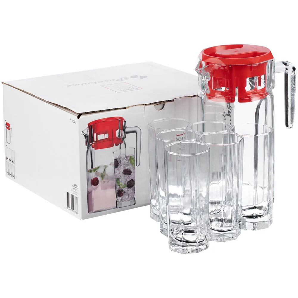 Набор Kosem из 6 стаканов и графина из прочного натрий-кальций-силикатного стекла. Рельефная многогранная поверхность стаканов идеально подходит для воды, сока и других напитков. Графин оснащен удобной пластиковой крышкой, которая плотно закрывается, — напиток не прольется случайно на стол.В наборе кувшин и 6 стаканов.